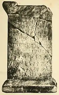 - 1 2 Letter from Professor Wright, 15 December, 1886; in the Proceedings of the Society of Biblical Archaeology: "Among the objects from Cyprus exhibited during the past summer at the Colonial Exhibition were two bilingual inscriptions, Phoenician and Cypriote, the property of Colonel F. Warren, R.A., who discovered them during his excavations at Frangissa... The longer and better preserved of these has been translated and published by the well known archaeologist M. D. Pierides, though without the Phoenician text... The smaller of Colonel Warren's two bilinguals is not nearly so well preserved, especially as regards the upper or Phoenician portion. I have sent a squeeze of it to Professor Euting, who will no doubt succeed in deciphering it with Dr. Deecke's help."