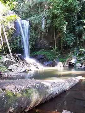 The Witches Falls section, on the eastern side of Mount Tamborine village, became Queensland's first national park in 1908.[1] The main walk here is the Witches Falls Circuit (3 km (1.9 mi)) which snakes down a steep slope through closed in forest into rainforest with cycad groves, seasonal lagoons, enormous strangler figs and palm groves, en route to the falls. An alternative way of seeing the falls is via the Beacon Road Track (four km one way). Access is off Main Western Road (also known as Tamborine Mountain Road and Geissmann Drive). Subtropical rainforest containing large red cedar trees and strangler figs is the predominant vegetation here.[3]