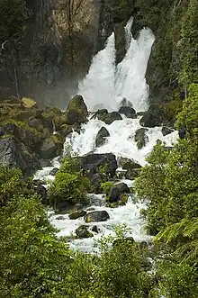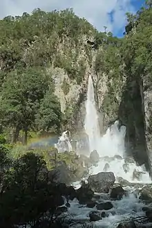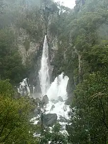 The Tarawera River flows out of Lake Tarawera and across a rhyolitic lava flow that erupted from Mt Tarawera about 11,000 years ago. The river disappears about 30 metres back from the clifftop into flooded caves in the lava and pours out halfway up the cliff on the far side of the flow.[2][3]