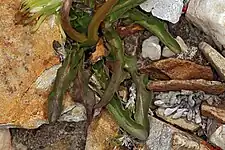 The fruit of Taraxacum ceratophorum are sessile cypselas with a persisting calyx. They are dry, obovate, and typically a pale reddish brown or brick red colour. The cypselas measure 4 to 5 mm in length and 0.9 to 1.2 mm in width, appearing glabrous and exhibiting ribbed surface venation. They are indehiscent, and the slender beak of the cypselas often exceeds the length of the body. The upper half of the cypselas' surface is spinulose. Each cypselae possesses a single seed.[3] The seeds utilize wind dispersal. The pappus of each seed helps amplify drag, which increases the chance that wind will carry it away and prolongs its descent.[4]