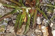 Taraxacum ceratophorum possesses a taproot. The taproot is robust, supporting the growth and stability of the plant. Additionally, the species exhibits a caudex with a diameter of approximately 5 to 10 mm. The caudex serves as a transition zone between the taproot and the basal leaves.[3]