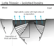 At the beginning of the Jurassic, the early basin remained narrow but was subject to transgression by seawater. This resulted in the creation of a shallow sea that was often subject to large changes in water depth. As saltwater filled the shallow sea, evaporation caused the loss of seawater while leaving salt in the basin. Over the course of 1 million years, upwards of 1,500 meters of salt was deposited.[5] Salt migration began during Jurassic with sediment loading. However, the main mechanisms for the salt migration developed later.[6]