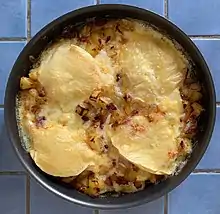 Tartiflette (French pronunciation: [taʁtiˈflɛt]) is a dish from Savoy in the French Alps and from Aosta Valley. It is made with potatoes, reblochon cheese, lardons and onions.[1][2] A splash of white wine can be added too.[3]