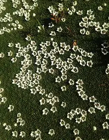 Tasmanian cushion plants are low growing, highly compact, woody, spreading mats that can grow up to 3 m in diameter, located mainly on the island of Tasmania. These mats are made up of tightly packed stems that grow at the same rate so that no apical rosettes protrude above the rest. The term cushion plant refers to a characteristic growth habit adopted by various species from a range of families to adapt to alpine and subalpine environments and areas of high latitude.[1] They are adapted to grow in low nutrient areas and typically have deep taproots. Cushion plants are very slow growing and do not grow high above ground; mounds typically remain under 30 cm high. Underneath the living surface of the cushion, the plants either allow dead leaves to persist or produce non-photosynthetic material, resulting in an insulating effect.