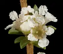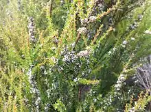 The shrub has an erect form and typically grows to a height of 3 to 4 metres (10 to 13 ft). It blooms between July and October producing white flowers.[2] It can be grown as an ornamental shrub in the garden where it is hardy and has dense foliage. The small white flowers grow in masses and the foliage is aromatic. The shrub is drought tolerant once established and will also tolerate light frosts.[1]