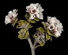 The shrub has a spindly, erect to spreading and procumbent form, typically growing to a height of 2 metres (7 ft).[1] The leaves are typically 3 to 7 millimetres (0.12 to 0.28 in) in length.[2] It blooms between September and October producing small white petal flowers[1] with a diameter of approximately 1 cm (0.39 in) that appear in dense cluster of about 20 flowers. Each flower contains about 10 stamens, one opposite each sepal and petal.[2]