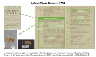 A taxonomic treatment is a section in a scientific publication documenting the features of a related group of organisms or taxa.[1] Treatments have been the building blocks of how data about taxa are provided, ever since the beginning of modern taxonomy by Linnaeus 1753 for plants[2] and 1758 for animals.[3] Each scientifically described taxon has at least one taxonomic treatment. In today’s publishing, a taxonomic treatment tag[4]