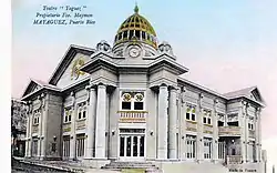 It was originally erected by Francisco Maymón Palmer in 1909. Maymón's parents emigrated to Puerto Rico from Italy in the 19th century. They settled in the town of San German. Early in the 20th century Francisco tried to build a theatre in the town of San German but was unable due to the existing religious culture then, which considered a theatre as a "bad influence' on the local population. Maymón was an entrepreneur by vocation, having travelled to Europe and the United States in his 20s, and he would not be stopped. He moved to the nearby city of Mayaguez where he established himself as one of the pioneers of the industry of cinematography in the island of Puerto Rico, introducing this new form of Visual Art early in the beginning of the 20th century by showing silent films throughout the nearby towns and becoming the exclusive distributor for 'Nicholas Power Co.' movie projectors throughout the Caribbean islands. The 'Nicholas Power Company' was located in New York. With the help of his business partners Mr. Jose Rahola and Mr. Fundador Vargas, he imported movies from the Pathé Company in Europe, showing them in town centers (plazas) under the stars and at the old Mayaguez Municipal Theater ('Teatro Municipal'). The latter no longer exists, as it was destroyed in the 1918 earthquake that hit the city and was never rebuilt, hence the Teatro Yagüez became the city's preferred gathering place for opera, plays, concerts, and silent movies.