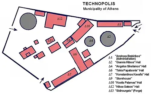 Technopolis (Gazi) is an industrial museum and a major cultural venue of the City of Athens, Greece, in the neighborhood of Gazi, next to Keramikos and very close to the Acropolis. It is dedicated to the memory of the great Greek composer Manos Hatzidakis, which is why it is also known as "Gazi Technopolis Manos Hatzidakis".[1] It has been in operation since 1999 and is situated in the city's former gasworks which were founded in 1857, occupying an area of about 30.000 m2. Numerous exhibitions, seminars, music concerts and other cultural activities take place in the grounds. Eight of the buildings of the compound bear the names of famous Greek poets: Andreas Embirikos, Angelos Sikelianos, Yannis Ritsos, Kostis Palamas, Takis Papatsonis, Constantine Cavafis and Kostas Varnalis. On the second floor of the Angelos Sikelianos building is a museum dedicated to the renowned opera singer Maria Callas.