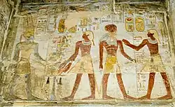 The finest painted reliefs are in the innermost section of the temple where Thutmose III and Amenhotep II are shown being embraced or making offerings to various Egyptian gods.[2] The left hand side of the vestibule shows Amenhotep II being crowned by Horus and Thoth and running with an oar and a hap (or navigational instrument).[2] The cult room at the side of the sanctuary contains some interesting foundation and consecration scenes for the temple which depict "the ritual of the 'stretching of the cord', the ceremonial making and laying of bricks, and the offering of the temple to its gods."[2]