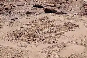 The control of a multitude of goods intended for export ensured a degree of financial self-sustainability for the temple that also may have been aided by tourists passing through the temple. The latter is evidenced by a variety of small portable "souvenir" altars uncovered within the temple. In addition, inscription fragments intended for temple officials demonstrate other external sources of revenue brought to the temple in the form of offerings and distributed among priests and other personnel.[6] A recent re-translation of an inscription found in the temple (shown below) lists the donation of gold and silver bullion to the temple while also voicing concern that this payment be adequately used for the needs of the temple, exclusively, highlighting a possible preexisting misappropriation of temple revenue by priests at Petra.[6]