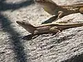 The brown anole is very invasive and reaches exceptionally high population densities. The brown anole seems to be taking over the green anole's habitats. The brown anoles have even been known to eat green anoles.