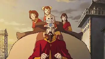 Book Four saw the Air Nation make good on Tenzin's promise to assist others. They primarily focused their efforts around the Earth Kingdom which had fallen into disarray after the murder of the Earth Queen.[27] Tenzin, who in effect was the political head of the Air Nation, was present at Wu's coronation ceremony when Kuvira appointed herself as the leader of the new Earth Empire. Concerned about Kuvira's declarations, Tenzin and the world leaders convened after the coronation and agreed to send Suyin Beifong, Lin's half-sister, as their representative to speak with Kuvira and convince her to step down. However, Kuvira was unmoved, holding on to her position.[28] Tenzin subsequently tasked his children with a mission to locate Korra, whose whereabouts at this point were unknown, and bring her to Republic City.[29] The children would successfully complete their mission returning Korra back to Republic City. When Korra shared with Tenzin that she felt like a failure in being badly outclassed by Kuvira in a battle, Tenzin stated no one expected her to face the dictator alone and that it was everyone's responsibility to resolve the Kuvira crisis.[30] Several days later, Tenzin attended a meeting to discuss the Republic City's evacuation process in the scenario that Kuvira attacked the city. The meeting was interrupted by Lin, Suyin, Zhu Li, and Bolin, the latter who informed him the existence of Kuvira's powerful cannon. When Zhu Li added that Kuvira planned to invade the city two weeks later, Tenzin returned to his family at Air Temple Island to encourage them to leave the city. Instead, Pema and his three eldest children elected to stay and assist in any way possible. Later, Tenzin was chosen by Korra to be part of a stealth airbender team tasked with kidnapping Kuvira's fiancé, Bataar Jr, with the intention of using him as a bargaining chip against Kuvira. Utilizing their wingsuits, they successfully acquired their target, dumping him in a large traveling bag and transporting him to their hideout. Tenzin stood by as Korra eventually managed to force Baatar Jr. to contact Kuvira to call off her attack. To everyone's surprise, Kuvira traced the radio signal back to their location and decided to destroy it with her cannon. Tenzin narrowly escaped certain death.[31] Tenzin and his friends would eventually emerge victorious over Kuvira and her army.[32] In the series denouement, Tenzin hosted and attended Varrick and Zhu Li's wedding ceremony on Air Temple Island. Outside the after-party, Tenzin engaged in a conversation with the Avatar. Tenzin complimented his pupil noting that she transformed the world more in the few years than most of her predecessors did in their lifetimes. Tenzin was pleased to hear Korra confide that she felt her journey had only begun and that she desired to learn and do more. The moment was interrupted by Asami, however, who informed him that Varrick desired to borrow a wingsuit and jump off a tower. Tenzin immediately ran off to stop Varrick.[33]