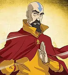 Tenzin is a lead character in the series, serving as Korra's airbending master and spiritual mentor. He is the son of Aang and Katara. As the only airbender to be born in over a hundred years, Tenzin was taught the traditions and customs of the Air Nomads by his father, eventually earning the traditional Air Nomad tattoos. Tenzin inherited most of his father's mementos prior to his father's death.[3] After Korra (who would eventually become Tenzin's student) was revealed at a very young age as the new Avatar, Tenzin, along with Sokka, Zuko, and Korra's father, Tonraq, thwarted an attempt to kidnap the child. The kidnappers, led by Zaheer, were apprehended and imprisoned. Because of this threat and the potential for future threats, Tenzin and Tonraq elected to move Korra to a compound at the Southern Water Tribe where she could live and train in safety.[4]