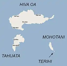 Terihi is a small, uninhabited, rocky island in the Marquesas Islands, less than 300 m (0.19 mi) southeast from Mohotani. It has an area of 0.15 square kilometres (0.06 square miles) and a coastline of 3.40 kilometres (2.11 miles).