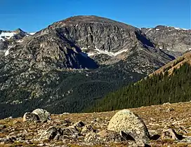 Terra Tomah Mountain is a 12,718-foot-elevation (3,876-meter) mountain summit located in Rocky Mountain National Park, in Larimer County, of Colorado, United States.[3] It is situated 13 miles west of the community of Estes Park, and 1.5 mile east of the Continental Divide. Terra Tomah Mountain is part of the Front Range which is a subset of the Rocky Mountains. Topographic relief is significant as the northeast aspect rises 3,300 feet (1,000 meters) above Forest Canyon in 1.5 mile. It is a prominent landmark viewed from Forest Canyon Overlook along the Trail Ridge Road.