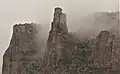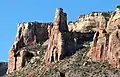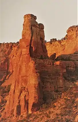 Terra Tower is a 5,790-foot-elevation (1,760-meter) sandstone pillar located in Colorado National Monument, in Mesa County of western Colorado, United States.[3] This 350-foot-high tower is situated on the Redlands escarpment, approximately seven miles west of the community of Grand Junction. Topographic relief is significant as it rises 1,000 feet (300 meters) above the Tiara Rado Golf Course in approximately one-half mile. The first ascent of the summit was made in 1979 by Harvey Carter and Tom Merrill via the class 5.11 route, Way Bazaar.