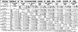 The Texas-Southern League was a sports league of minor league baseball teams that operated from 1895 to 1899, primarily in Texas.[1]: 168 During the 1896 season, the league renamed itself as the Texas Association. History of the Texas-Southern League / Texas Association prior to 1900 follows.
