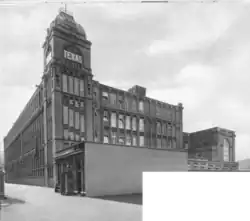 This was a 30 bay mill designed by Sydney Stott, it had his trademark double rings on its chimney. It was four storeys high built on a basement from engineering brick. It had a Hotel-de-Ville style water tower.