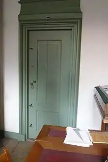 The long hallway has the function of dividing the house in two, and the Teylers Stichting has used the various ground floor rooms for the location of the library and the meeting rooms for the directors, the religious society and the science society. The room at the back of the garden was used for member meetings. After the Oval Room was built, visitors could pass along the hallway through the meeting room to the Oval room. The old office used by Teyler himself became the office of the curator, and two smaller adjacent rooms with doors contain 3 and 5 locks, one for the Teylers Stichting and one for the science society, which held Teyler's coin and medal collection, the most valuable part of the collection on Teyler's death. The room with 3 locks could only be opened when all three key owners were present, and the room with 5 locks could only be opened when 3 of 5 keyholders were present. Considering the complicated lock system, there was clearly reason to fear theft of the items in the medal collection and in the early days the collection was only available by appointment.