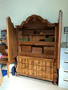 The building was built in 1715 for the wealthy commissioner of the Haarlem City Justice department, Hendrik Adriaan van der Marck. Van der Marck had a large library and when he died in 1740 Teyler bought the house in order to have more room for his growing library and collection of curiosities and stuffed birds.[1] Teyler moved in with his wife, and they lived together there for 14 years until she died in 1754. The Teylers did not seem to take great pains to remodel the house, as the plaster work in the hallway downstairs still shows the Van der Marck family coat of arms.[1] Upstairs in a back room, Teyler kept office (comptoir) as a banker, and this office still has the original cabinet with his banker archive. Two years after his wife died Teyler drew up his will with the intention of preserving the house as a gift to the city, though he himself lived for another 22 years.[1]