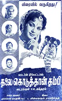 Thalai Koduthaan Thambi (transl.Younger brother gave his head) is 1959 Tamil-language historical action film , directed and produced by T. R. Sundaram of Modern Theatres,[1] and written by Murasoli Maran. Music was by Viswanathan–Ramamoorthy. It stars S. S. Rajendran, R. S. Manohar and Malini.