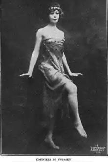 De Swirsky, publicized in 1911 as having the "most musical body in the world",[4] "created a sensation" in the United States with her barefoot dancing.[5] Reviewers assured (or warned) readers that, while her feet were bare, she did not dance nude.[6] "Her costumes are triumphs of sartorial amplitude," declared one disappointed critic. "They leave everything to the imagination."[7] She also performed a "bat dance" with billowing sheer fabric wings.[8][9] She was the last advertised performer to appear at the Coliseum Garden Theatre in Raton, New Mexico, before it was destroyed in a 1911 fire.[10]