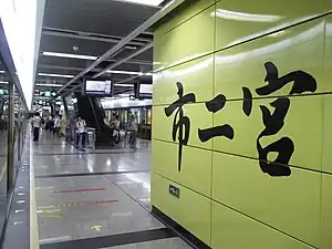 The 2nd Workers' Cultural Palace Station or Shi'ergong Station (Chinese: 市二宫站; Jyutping: si5 ji6 gung1 zaam6; Cantonese Yale: Síhyihgūng Jaahm) is a station on Line 2 of the Guangzhou Metro. It is situated underground at the junction of Jiangnan Avenue (江南大道) and Tongfu Road (同福路) in the Haizhu District and began operation on 29 December 2002.[1] The streets of the local area are noted for selling wedding dresses.[2]