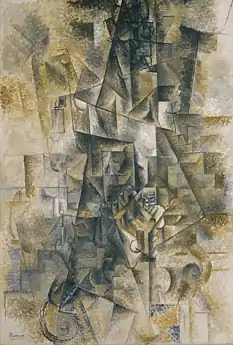 This painting was produced during a period in Picasso's art known as Analytical Cubism. Cubism was developed between 1907 and 1914 by Picasso and Georges Braque after they met in 1907.[1] It was an innovative new style of art, which in its early stages involved breaking surfaces into sharply defined planes. In 1911, Picasso and Georges Braque spent the summer at Céret, in the French Pyrenees, a period that is considered to be an important moment in the development of Cubism.[2]