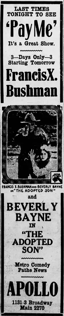 In August 1917 it was announced that Metro had obtained the rights to an unpublished, untitled story by Max Brand.[2] This was one of several films which paired Bushman with Bayne,[3] and was produced in Ithaca, New York.[4] In September 1917 it was announced that Bushman and Bayne had gone on location to film sequences for the picture, which was at that time still untitled.[5] The original working title for the film was God's Outlaw.[6] By mid-October the film's titled had been changed to The Adopted Son.[7] The story, by Max Brand, was scheduled to be published simultaneously in All-Story Weekly with the picture's release. The magazine's cover art featured Bushman and Bayne.[4] The film was released on October 29, 1917.[8]