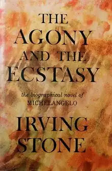 The Agony and the Ecstasy (1961) is a biographical novel of Michelangelo Buonarroti written by American author Irving Stone. Stone lived in Italy for years visiting many of the locations in Rome and Florence, worked in marble quarries, and apprenticed himself to a marble sculptor. A primary source for the novel is Michelangelo's correspondence, all 495 letters of which Stone had translated from Italian by Charles Speroni and published in 1962 as I, Michelangelo, Sculptor. Stone also collaborated with Canadian sculptor Stanley Lewis, who researched Michelangelo's carving technique and tools.[2] The Italian government lauded Stone with several honorary awards for his cultural achievements highlighting Italian history.