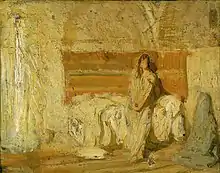In 1897, Tanner embarked on a trip to Egypt and Palestine.[2] The trip was sponsored by Rodman Wanamaker, whose comment that "in the Orient the light, both interior and exterior, the mannerisms of the people, the costumes and habits of living, all are vastly different from anything that could be imagined in the West" likely influenced Tanner's development of The Annunciation[3] and subsequent settings of his religious paintings.[6]