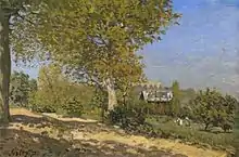 British by birth, Sisley was unable to fight in the Franco-Prussian War and - fleeing the Siege of Paris - he first stayed at Louveciennes in autumn 1870, at which time he painted First Snow at Louveciennes (Boston Museum of Fine Arts), showing rue de Voisins, near Renoir's mother's house in the hamlet where he had set up his studio. He also produced a series of paintings showing the peak of the side of the Cœur-Volant. In spring 1871, with Paris in the control of the Commune, Sisley again took refuge in Louveciennes, this time at 2 rue de La Princesse. He found his studio ransacked by the Prussian troops, meaning few paintings of Louveciennes from before 1871 survive. He remained in the town until winter 1874-1875, painting several snowy landscapes with pink, yellow or blue tints.[3]