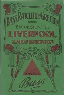 The Bass Excursions were a series of works outings laid on for the entire workforce of the Burton-on-Trent brewing firm of Bass, Ratcliff & Gretton. They took place every summer, and ran from the 1860s until 1914. The last one, to Scarborough, took place just weeks before the outbreak of the First World War. The excursions, which were originally just for workers, quickly expanded to include wives and children, along with managers and suppliers. So many townspeople were included that, on the day, the town's population of 50,000 was reduced by nearly a fifth.[1] Workers travelled free – with family members at a greatly reduced rate – and were given their day's wages, plus extra pocket money of a half crown to a guinea, depending on their status.[2][3] Once there, production of their excursion ticket allowed free entrance to all the resort's attractions.