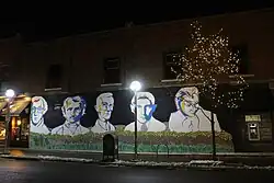 The Bookstore Mural is an outdoor mural by Richard Wolk located on the corner of Liberty Street and State Street in downtown Ann Arbor, Michigan, US. The mural is an Ann Arbor icon, and is one of the city's most well-known pieces of public art. The work, colloquially referred to as the Bookstore Mural, was painted in 1984 by Richard Wolk[1] and was commissioned by David's Books, the building's former occupants.[2] The mural depicts the headshots of Woody Allen, Edgar Allan Poe, Hermann Hesse, Franz Kafka, and Anaïs Nin. It is approximately 60 by 20 feet (18 by 6 m).