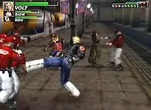 The Bouncer is structured as a series of short gameplay segments interspersed with cinematic cutscenes that tell the game's story. With the Active Character Selection (ACS) system, when a cutscene concludes, the player is given the choice to control one of the three protagonists and proceed onto the next gameplay segment.[5] The player then controls this character for the duration of the level, whilst the other two characters are controlled by the AI. At the conclusion of each gameplay segment, the player is able to spend Bouncer Points (BP), the game's equivalent of experience points, using the Point Exchange System. BPs can be used to boost the character's statistics (health, power and guard) and unlock new fighting moves.[6] Spending BPs allows the character to level up, with their rank graded on a letter scale from G to A, and finally, an S-Rank.[7]