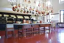 The kitchen - Kitchen – The kitchen, unlike others in the time period, was situated on the first floor away from the main house to prevent the possibility of fires and cooking smells reaching the main parts of the house. The well-ventilated room supports a 21 ft (6.4 m) cast iron stove, which heats up as a single element through a coal burning stove. The work table is made of zinc, a metal which served as the forerunner to stainless steel; in front of it is a marble mortar used to crush various ingredients. Ice cut in winter from the local ponds kept the side rooms cool where food was stored, and facilitated a colder room for the assembling of confections.[12] The kitchen and baking pantry each have one dumbwaiter that travels to the basement level where groceries were delivered and refuse removed.