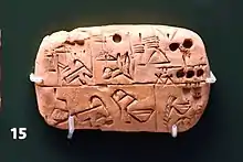Clay tablet, late Uruk period, 3300-3100 BCE. Proto-cuneiform signs, food issue list " rations" written by combining a human head and a bowl. No provenance. Purchased via Christie's in 1989, with contribution from the British Museum Friends