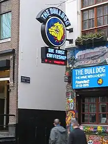 The Bulldog is an Amsterdam-based company that owns and operates a chain of cannabis coffee shops, hotels, cafés and brand stores located in Amsterdam and Canada.[1] The Bulldog has its own merchandising brand consisting of clothing, souvenirs and smoking accessories. The group logo consists of a cartoon figure of a bulldog on a round frame.[1]