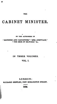 The Cabinet Minister is an 1839 novel by the British writer Catherine Gore, originally published in three volumes.[1] [2] It is part of the tradition of silver fork novels popular during the era which focus on the upper-classes, and part of a subset of books which focus on British politics. It follows events in the Whig movement from the Regency Crisis of 1810 through the Great Reform Act in 1832 to the present in the early years of Queen Victoria's reign.[3]