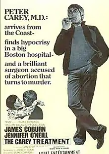 The Carey Treatment is a 1972 American crime thriller film directed by Blake Edwards and starring James Coburn, Jennifer O'Neill, Dan O'Herlihy and Pat Hingle. The film was based on the 1968 novel A Case of Need credited to Jeffery Hudson, a pseudonym for Michael Crichton. Like Darling Lili and Wild Rovers before this, The Carey Treatment was heavily edited without help from Edwards by the studio into a running time of one hour and 41 minutes; these edits were later satirized in his 1981 black comedy S.O.B..[1][2]