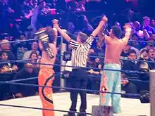 Starting in November, The Colóns developed an on-screen relationship with The Bella Twins (Nikki and Brie), appearing in numerous backstage segments with them and The Bellas accompanied them to the ring.[6] This relationship with the Bella Twins subsequently led to a feud with the World Tag Team Champions John Morrison and The Miz, as Morrison and The Miz flirted with The Bella Twins, and then defeated Carlito and Primo to win a date with them on Valentine's Day.[7] The Bella were seemingly unable to choose between the teams, leading to Morrison and The Miz challenging The Colóns for the WWE Tag Team Championship, and The Colóns challenging Morrison and The Miz for the World Tag Team Championship, although each team retained their respective championship.[8][9] The rivalry between the teams led The Bella Twins to fall out with each other, with Brie siding with the Colóns, and Nikki siding with Morrison and The Miz.[10] On the WrestleMania 25 pre-show, The Colóns defeated Morrison and The Miz to win the World Tag Team Championship and become the Unified WWE Tag Team Champions, and they successfully defended the championships the following night on Raw.[11][12]