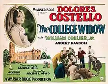 The College Widow is a 1927 American silent comedy film produced and distributed by Warner Bros. and directed by Archie Mayo. The film is based on the 1904 Broadway play of the same name by George Ade and was previously adapted to film in 1915 with Ethel Clayton. The 1927 silent film version is a starring vehicle for Dolores Costello.[2][3][4]