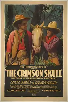 The Crimson Skull is a 1922 American silent Western mystery film that was produced by the Norman Film Manufacturing Company.[1] The six-reel film was made on location in Boley, Oklahoma[2] and was made along with The Bull-Dogger, which its release followed.[3] Local cowboys appear in the film backing up the actors and professional rodeo performer Bill Pickett.[4] It was marketed as a "Baffling Western Mystery Photo-play". The film is considered lost. Press books for the film remain in existence.