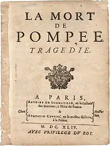 The Death of Pompey (La Mort de Pompée) is a tragedy by the French playwright Pierre Corneille on the death of Pompey the Great. It was first performed in 1642, with Julius Caesar played by Molière. Like many of Corneille's plays, it is noted for the high tones of its heroine, Cornelia, who admits that her enemy is noble and generous but warns him when he releases her that she will continue to seek his death.[1]