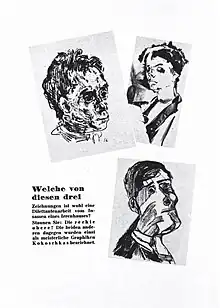 In 1937 the painting was confiscated by the Nazi regime as part of a coordinated effort to purge so-called "degenerate art" from the Reich.[21] It was pilloried in the Munich Degenerate Art exhibition, where it hung on the south wall of room four opposite Kokoschka's The Bride of the Wind,[22] then held in storage at Schönhausen Palace until 1939,[23] when it was sold at the Degenerate Art auction at Galerie Fischer in Lucerne, Switzerland.[21] It was lot number 65 in the auction and sold for 3,000 Swiss francs.[24]