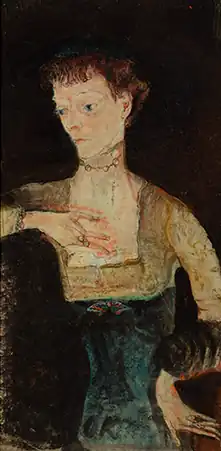 In late 1909 Kokoschka accompanied Loos to Switzerland to paint a portrait of Loos's girlfriend Bessie Bruce, who was being treated for tuberculosis in a sanitarium there.[6] Kokoschka ended up staying the entirety of winter 1909-10 in Switzerland, a period that was "extremely fruitful" for him.[7] Thanks to Loos's tireless promotion[8] he would end up painting at least five other portraits while there, among them The Duchess of Montesquiou-Fezensac.[9]