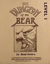 The Dungeon of the Bear is a 1979 role-playing game adventure for Tunnels & Trolls written by Jim "Bear" Peters and published by Flying Buffalo. Originally published as three separate booklets (Level 1, Level 2, Level 3) these were combined with an entrance-level (Castle Ward, written by Michael Stackpole) and republished in 1982 as "The Complete Dungeon of the Bear". A referee is required to play.