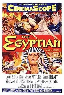 The Egyptian is a 1954 American epic historical drama film made by 20th Century-Fox. Filmed in CinemaScope with color by DeLuxe, it was directed by Michael Curtiz and produced by Darryl F. Zanuck. It is based on Mika Waltari's 1945 novel of the same name and the screenplay was adapted by Philip Dunne and Casey Robinson. Leading roles were played by Edmund Purdom, Bella Darvi, Jean Simmons, Victor Mature, Gene Tierney, Peter Ustinov, and Michael Wilding. Cinematographer Leon Shamroy was nominated for an Oscar in 1955.