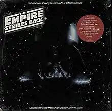 In 1980, the disco label RSO Records released the film's original soundtrack in a double-album, with two long-playing (LP) records. Combined, the two records featured seventy-five minutes of film music. This double LP package also included a booklet presentation with pictures of the main characters and action sequences from the film. Featured at the booklet's end was an interview with John Williams about the music and the new themes, such as "The Imperial March (Darth Vader's Theme)" and "Yoda's Theme". It also included a brief explanation of each track. The front cover artwork featured Darth Vader's mask against the backdrop of outer space; and the back cover featured the famous Gone with the Wind version of the poster art. As a side note, this package marked the final time a double LP soundtrack set was ever issued (Episode VI, the final film to have an LP soundtrack released, had only a single disc, also released by RSO Records). A double-cassette edition was also released.